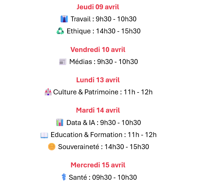 Afin de créer des synergies entre vous et d’éviter les risques de concurrence entre événements, nous organisons des réunions en visio d’1h par thématique.
